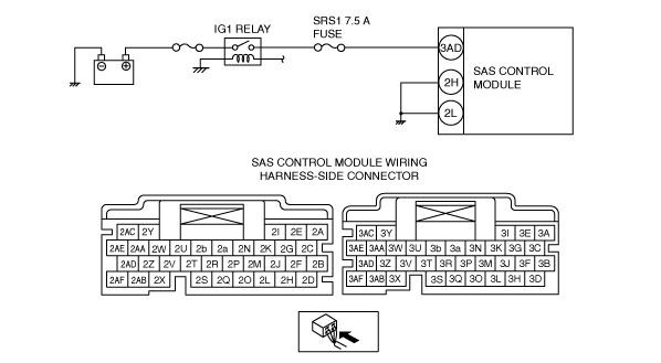 Refer to the wiring diagram and verify whether or not there is a common connector between SAS control module terminal and IG1 relay terminal.